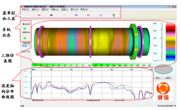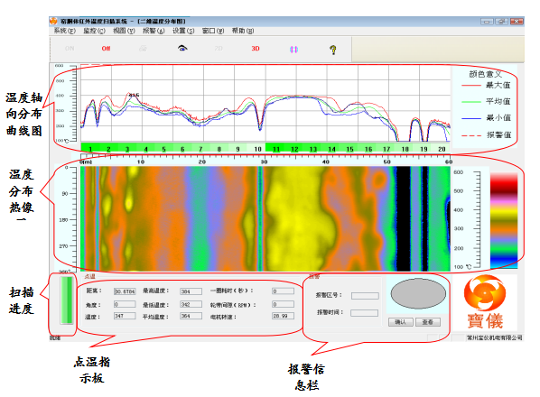 紅外掃描測系統(tǒng)的最大優(yōu)勢是非接觸、紅外線測溫、快速準確、運行周期長、真正無損檢測、解決了回轉窯運動所造成的測溫難的難題。它通過高速旋轉的直流無刷電機帶動紅外掃描儀內部掃描探頭高速旋轉,掃描探頭旋轉一圈,對窯表皮形成一條測溫掃描線,掃描探頭的掃描頻率為25-50線/S,每條測溫掃描線由3072個熱點組成。窯旋轉一周,為一個掃描周期。所采集的紅外線通過紅外探測器進行光電轉換,傳輸至計算機,通過安裝在計算機上的專用軟件,對數據進行運算、分析,然后在顯示器上以熱像儀圖像形式顯示出來。所得熱像儀圖像為模擬將回轉窯以0~360°展開圖。